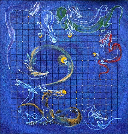 天空にうごめく龍たち。右下隅の龍は打ちひしがれた姿。なにげなく見えた光明が、中央の龍によって今まさに盤全体に輝こうとしています。天賦の才が強い意志を持った龍となって現れた瞬間です。この龍こそ時を越えて、若き日の本因坊秀策の姿を彷彿とさせます。