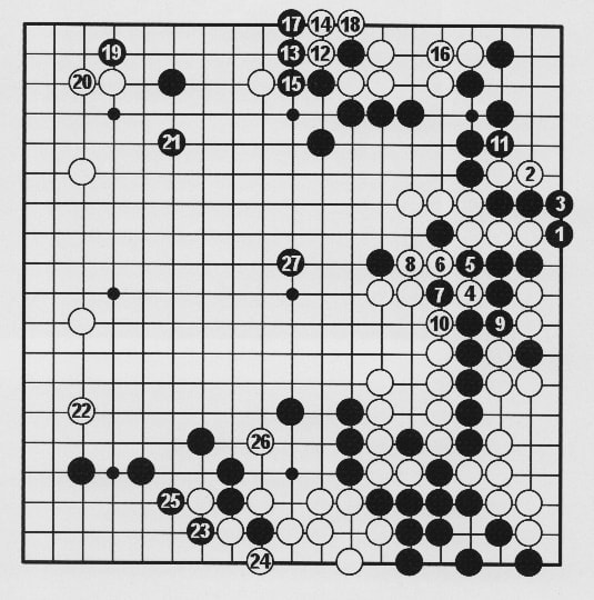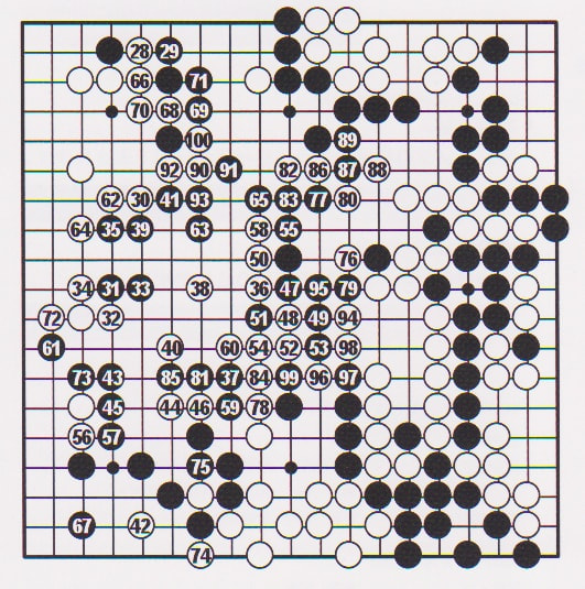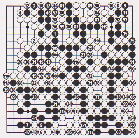 この龍は幾多の苦境をはねのけ、凛としています。調和の取れた威圧感はすでに名人の風格が備わった姿でした。相手は動揺し、その耳が赤くなったと伝わっています。耳赤の一手を境に形勢は不明から、徐々に黒に傾きました。